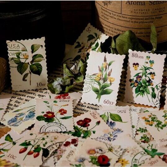 ビンテージ系シール ボタニカル フラワー フルーツ 植物 花 スタンプ の押された 切手 のような フレークシール 日記 や 手帳の コラージュ、ジャンクジャーナル に