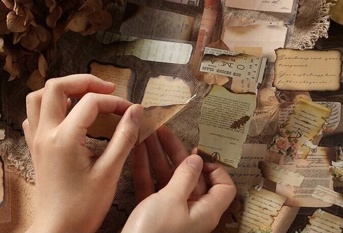 ビンテージ系シール 浮雲が世界を見つめているシリーズ 1種類 20ページ 海外製 焼け残った古い書類や絵などのシールブック PET 蝶 きのこ 楽譜 手紙 花 英文 各種ジャーナルやデコに