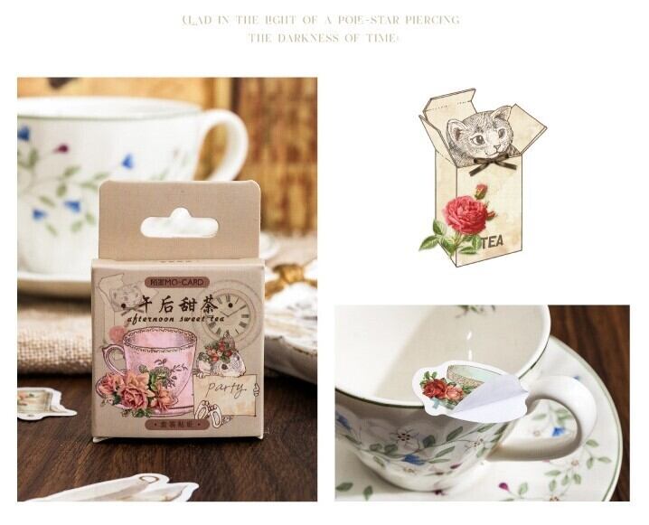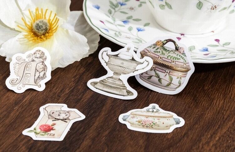 ビンテージ系シール 午後の甘いお茶 46枚 海外製 ティーカップなどお茶の時間に使用するアイテムを集めたフレークシール おしゃれ ティーセット 陶磁器 各種ジャーナルやコラージュに