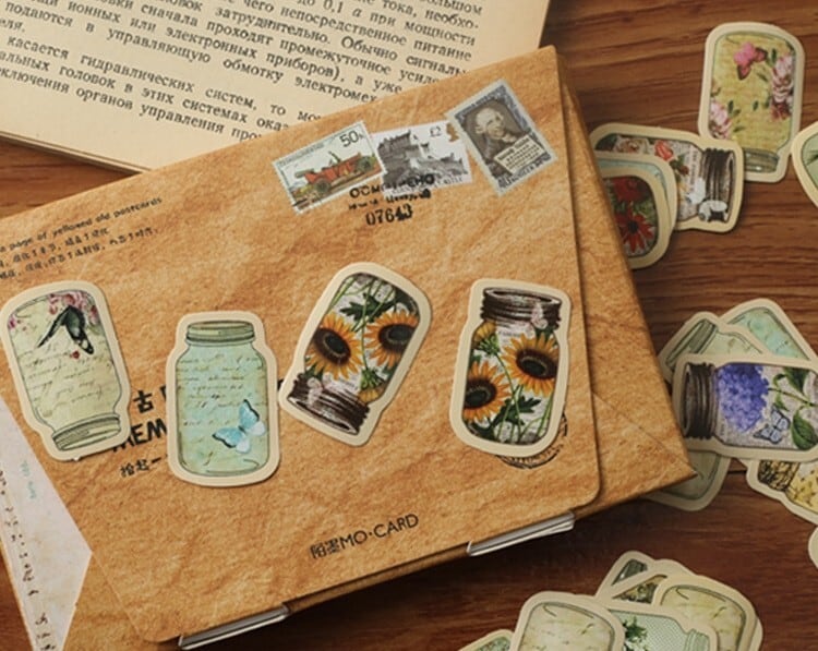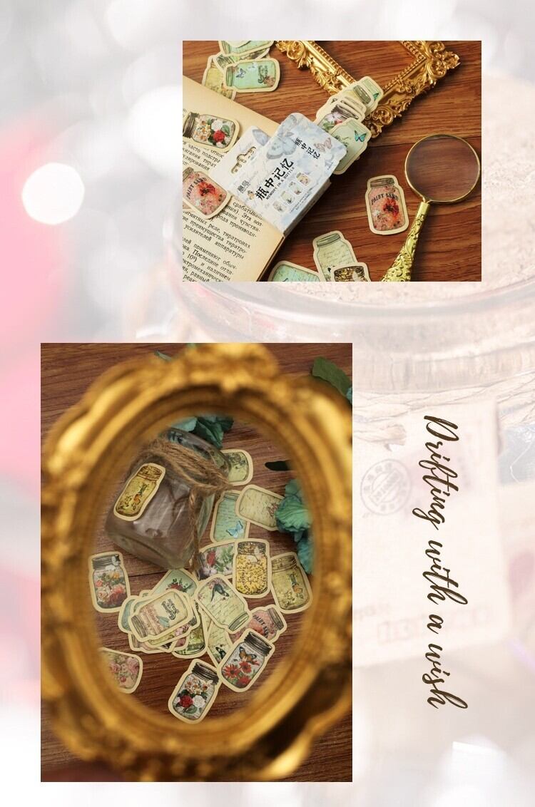 ビンテージ系シール 瓶の中の記憶 46枚 海外製 瓶の中に小さな世界が広がるフレークシール 蝶 花 英文 各種ジャーナルやコラージュに