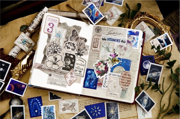 ビンテージ系シール 銀河の神秘シリーズ 全4種類 30枚 海外製 宇宙をテーマにしたシール 切手型 箔押し 月 惑星 星座 人工衛星 各種ジャーナルやコラージュ素材として